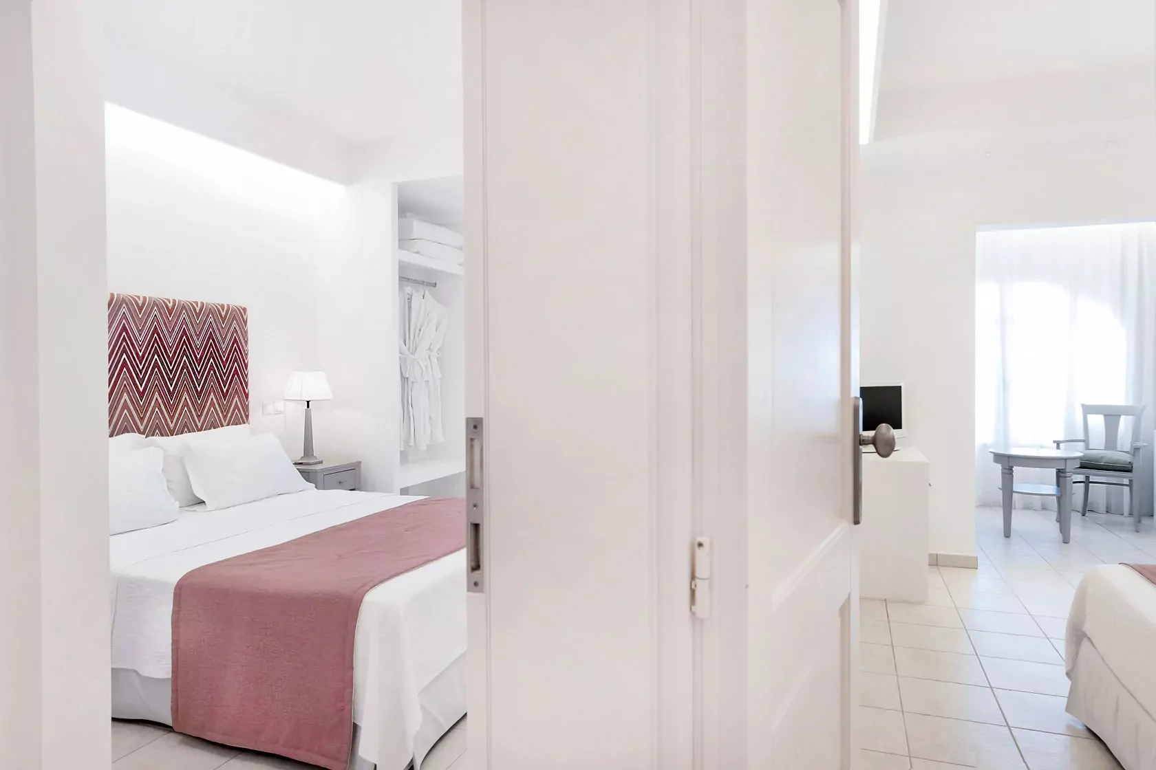 30m2 room on the first or second level with private sea view patio, high-quality, double-sized Media Strom bed, air-conditioning, mini fridge, sitting area, work desk, instant coffee, hot water kettle, hair dryer, safe, wifi, Pool and beach towels, ironing board, breakfast included.
